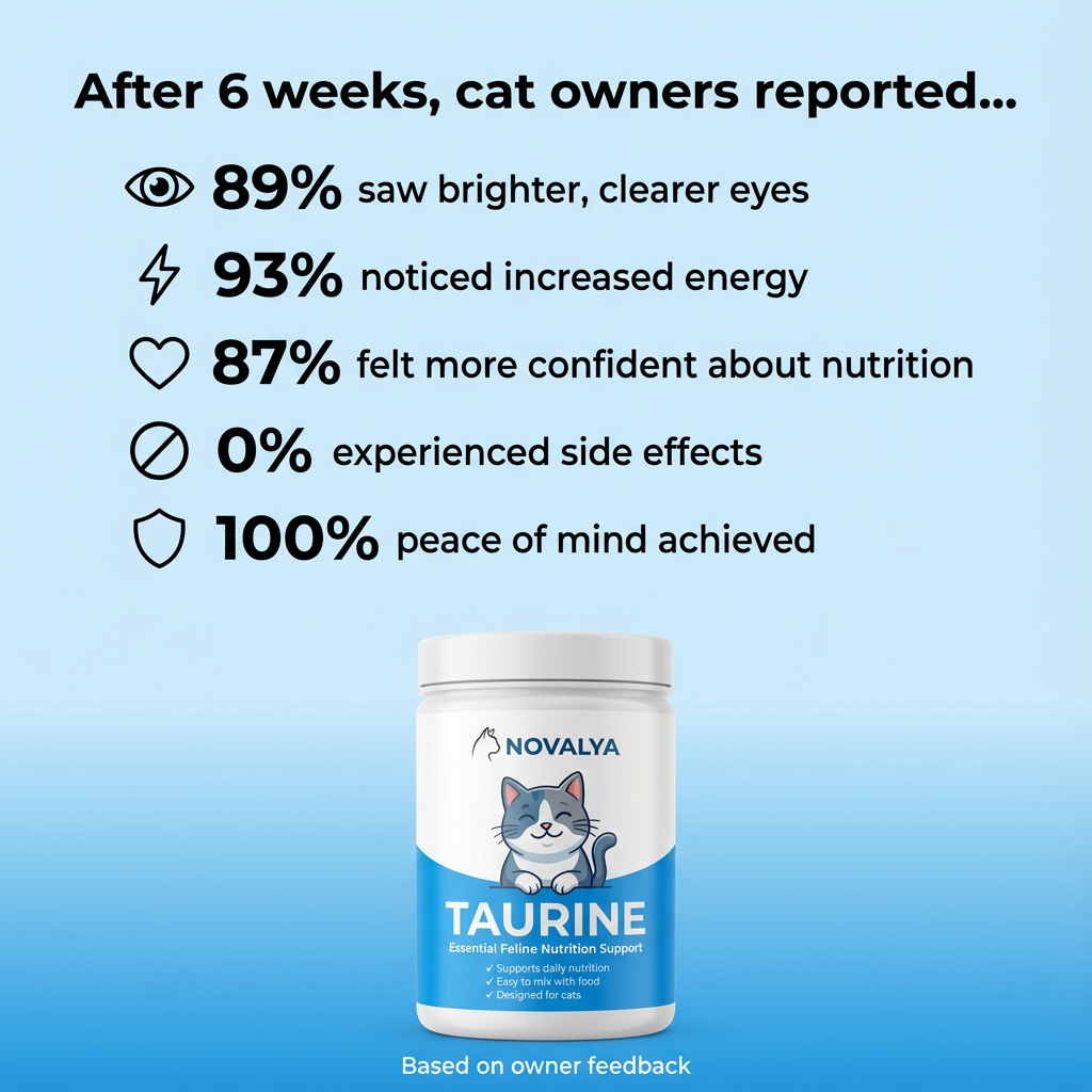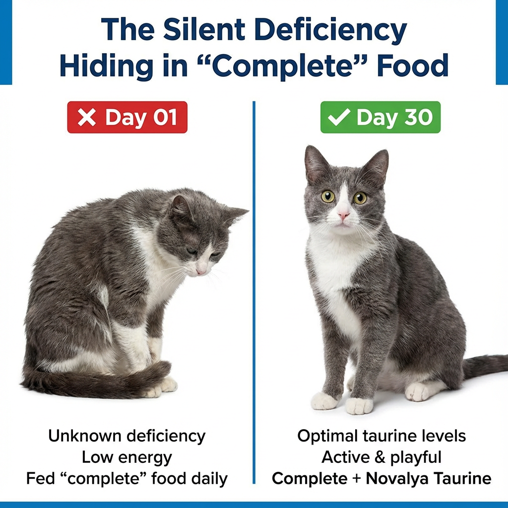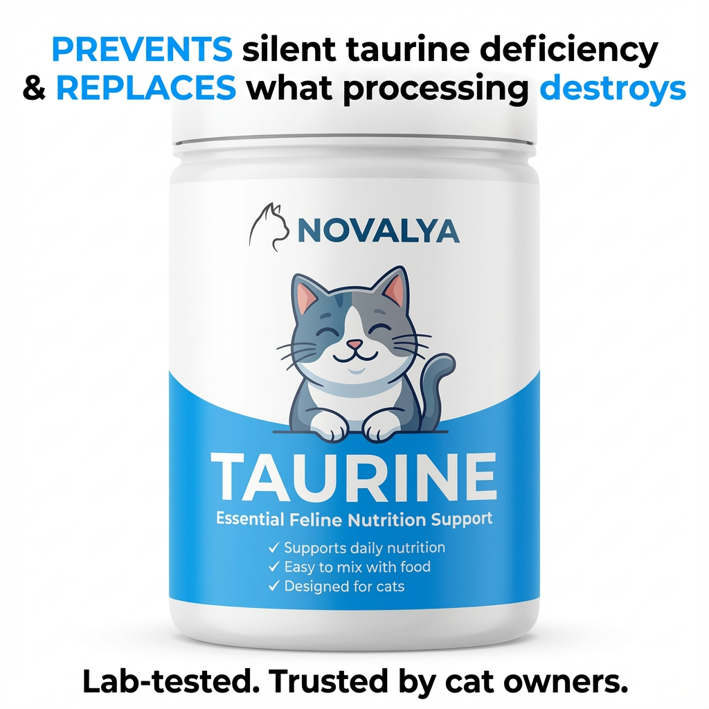 Most commercial cat foods lose a significant amount of taurine during cooking, processing, and storage. Even premium foods can fall short over time. Novalya™ ensures your cat gets enough taurine every single day.